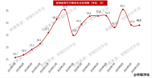 10月份,深圳新建寫字樓可售面積為138.1萬平方米,庫存量上升2.9%,總體呈趨勢性下降形態(tài)。新建寫字樓庫存去化周期為43.2個月,本指標(biāo)顯示庫存壓力依然巨大。