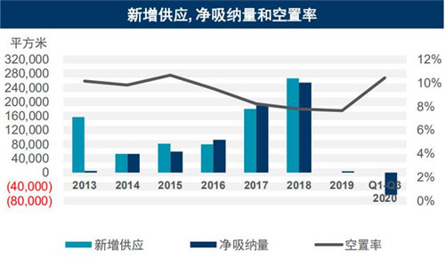 三季度,廈門甲級寫字樓市場迎來2020年首個入伙的項目——廈門寶龍國際中心,全市甲級寫字樓存量增加至128.65萬平方米。伴隨著“大招商”工作的加速落地,廈門甲級寫字樓市場逐漸回暖,吸納量由負(fù)轉(zhuǎn)正并錄得2018年三季度以來的最高值,達(dá)79285平方米。