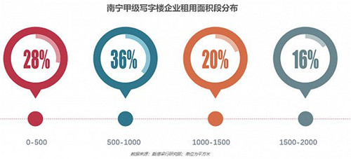 從2019年需求結(jié)構(gòu)來看,在房地產(chǎn)市場熱度較高的當(dāng)下,建筑業(yè)與房地產(chǎn)業(yè)成為南寧寫字樓市場的核心客群,二者租賃成交面積占比分別為32%、25%,相加接近六成;而專業(yè)服務(wù)業(yè)、TMT、金融業(yè)則分別占比12%、9%、9%,該行業(yè)構(gòu)成與多數(shù)一線城市及重點二線城市相去甚遠(yuǎn)。未來,作為帶動經(jīng)濟(jì)發(fā)展重要動力的TMT、金融業(yè)、專業(yè)服務(wù)業(yè)在南寧仍有著巨大的發(fā)展空間。此外,全年租賃成交中鮮見總部企業(yè)和外資企業(yè),可見當(dāng)前南寧商務(wù)市場對此類客戶的吸引力仍然有限,這也是未來在城市發(fā)展、政策支持等的促進(jìn)下可改善的一大方向,如總部型企業(yè)的引進(jìn)不僅可以大體量去化辦公物業(yè),還有助于集聚上下游關(guān)聯(lián)企業(yè),促進(jìn)產(chǎn)業(yè)鏈的完善。通過企業(yè)租用甲級寫字樓辦公空間面積段分布分析,租用1000平方米(含)及以下甲級寫字樓辦公空間的企業(yè)數(shù)量占比達(dá)64%,反映了中小型企業(yè)是現(xiàn)階段南寧甲級寫字樓租賃市場的主要客群,同時亦有部分大型企業(yè)的區(qū)域分支租用。