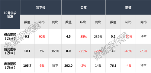 合富大數(shù)據(jù)顯示,10月廣州商業(yè)市場整體新增供應(yīng)環(huán)比大幅減少,寫字樓及商鋪僅有零星新增供應(yīng),環(huán)比降幅均超9成,同比去年基本持平,公寓新增供應(yīng)環(huán)比下降超8成,但同比去年大幅上升;成交方面,寫字樓由于大手交易支撐,10月成交有所上升,公寓及商鋪成交有所回落,公寓下降超2成,商鋪環(huán)比降幅近5成。庫存方面,整體庫存量基本持平并有減少的趨勢(shì)。