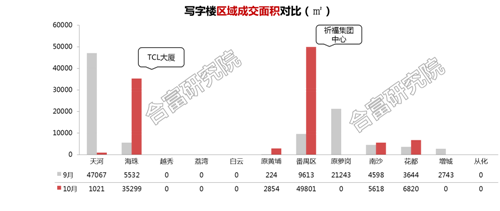 合富大數(shù)據(jù)顯示,10月全市寫字樓成交量為101413㎡,同比上升365%,環(huán)比9月份上升7%,由于大手交易較暢旺,9-10月市場保持強(qiáng)勢(shì)狀態(tài)。10月寫字樓新增供應(yīng)僅3000㎡,環(huán)比9月下降超9成,主要來自海珠區(qū)琶洲板塊的國美智慧城部分樓層。