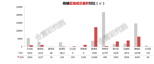 合富大數(shù)據(jù)顯示,廣州商鋪市場10月成交量為30448㎡,同比下降74%,環(huán)比9月下降46%;成交量為中等水平,近數(shù)月波動(dòng)幅度較大主要受大手交易影響。而10月商鋪新增供應(yīng)僅2000余方,主要來自廣鋼板塊的中海學(xué)仕里及花都恒大悅府的住宅裙商。