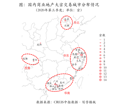 2020年三季度,國內(nèi)商辦投資市場(chǎng)逐漸復(fù)蘇,寫字樓、零售物業(yè)、倉儲(chǔ)物流等多個(gè)商業(yè)地產(chǎn)板塊均出現(xiàn)不同程度的需求回暖。本季度內(nèi)國內(nèi)共錄得55宗商業(yè)類大宗交易,總成交額達(dá)到483.93億元,成交面積173.47萬㎡;其中上海、北京、廣州、深圳四個(gè)一線城市錄得383.15億元,占比近八成;成交面積66.91萬㎡,占比近四成。