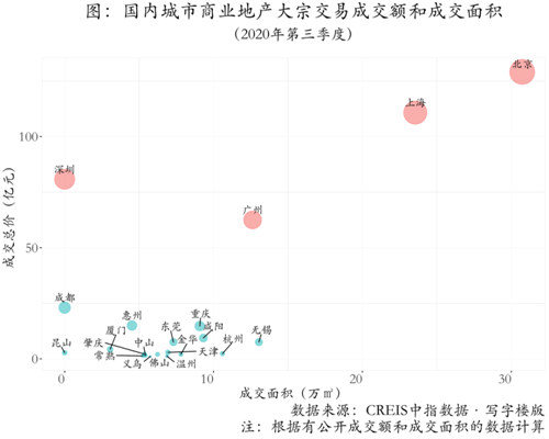 三季度,從成交額和成交面積來看,國內(nèi)投資市場(chǎng)整體表現(xiàn)有所回暖,總成交額達(dá)483.93億元,成交面積173.47萬㎡;其中北上廣深錄得383.15億元,占比79.18%;成交面積66.91萬㎡,占比38.57%。