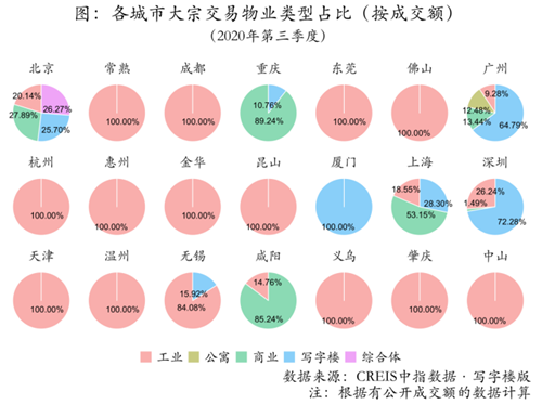 綜合數(shù)據(jù)來看,寫字樓依然占據(jù)大宗交易成交額的最大份額,一線城市優(yōu)質(zhì)寫字樓仍為投資熱點(diǎn),另外京杭周邊的工業(yè)廠房、大灣區(qū)的物流倉儲(chǔ)等工業(yè)物業(yè)較為走俏,熱度僅次于寫字樓。