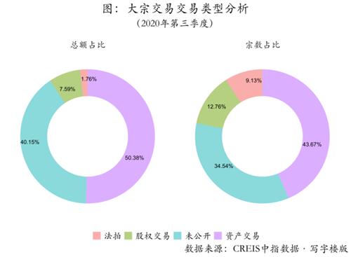 鑒于本季錄得的多宗寫字樓交易的交易目的多為自用,因此交易類型以資產(chǎn)交易為主,成交總額占比超過一半。個(gè)別商業(yè)零售項(xiàng)目則以股權(quán)交易的方式進(jìn)行(如8月28日,王府井?dāng)M收購由西安榮華集團(tuán)有限公司持有的陜西榮奧100%股權(quán),以達(dá)到持有該公司開發(fā)并持有的榮華奧特萊斯商業(yè)項(xiàng)目的目的),部分經(jīng)營不善的廠房物業(yè)則以不良資產(chǎn)法拍的方式進(jìn)行交易。