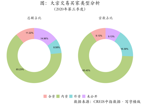 三季度,從收購方企業(yè)性質(zhì)來看,內(nèi)資買家的購置需求活躍,占據(jù)大宗投資市場(chǎng)的“絕對(duì)主力”,境內(nèi)險(xiǎn)資、大型TMT和金融公司是最活躍的買家。在境外疫情的持續(xù)影響下,差旅限制依然是制約外資買家交易推進(jìn)的主要因素,外資投資總額差強(qiáng)人意。