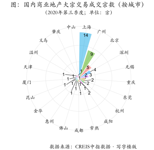 三季度,國內(nèi)商辦投資市場逐漸復(fù)蘇,寫字樓、零售物業(yè)、倉儲物流等多個商業(yè)地產(chǎn)板塊均出現(xiàn)不同程度的需求回暖。本季度內(nèi)國內(nèi)共錄得55宗商業(yè)類大宗交易,總成交額達(dá)到483.93億元,成交面積173.47萬㎡。