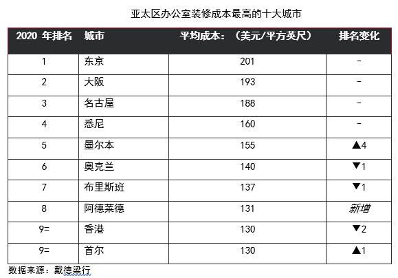 戴德梁行近期發(fā)布研究報(bào)告《2020-2021亞太區(qū)辦公室裝修成本指南》。報(bào)告顯示,亞太區(qū)辦公室裝修成本最高的前十位城市中,日本及澳洲城市保持多數(shù)席位。東京、大阪、名古屋、悉尼排名前四位,墨爾本今年的排名躍升了四位,位居第五。