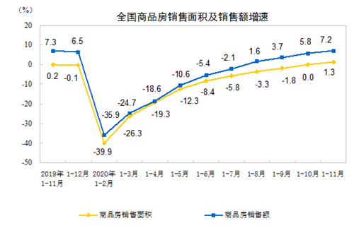 1—11月份,商品房銷售面積150834萬平方米,同比增長1.3%,增速比1—10月份提高1.3個百分點(diǎn)。其中,住宅銷售面積增長1.9%,辦公樓銷售面積下降12.8%,商業(yè)營業(yè)用房銷售面積下降11.1%。商品房銷售額148969億元,增長7.2%,增速提高1.4個百分點(diǎn)。其中,住宅銷售額增長9.5%,辦公樓銷售額下降10.7%,商業(yè)營業(yè)用房銷售額下降13.7%。