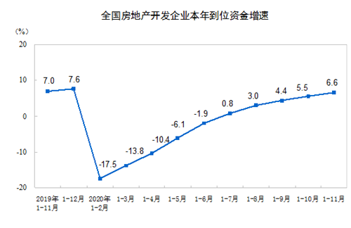 1—11月份,房地產(chǎn)開發(fā)企業(yè)到位資金171099億元,同比增長6.6%,增速比1—10月份提高1.1個百分點(diǎn)。其中,國內(nèi)貸款24256億元,增長5.4%;利用外資154億元,下降4.7%;自籌資金56666億元,增長7.9%;定金及預(yù)收款57384億元,增長5.3%;個人按揭貸款26983億元,增長10.6%。