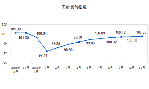 11月份,房地產(chǎn)開發(fā)景氣指數(shù)(簡稱“國房景氣指數(shù)”)為100.55,比10月份提高0.05點(diǎn)。