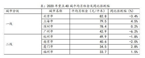 據(jù)貝殼研究院數(shù)據(jù),2020年全國(guó)重點(diǎn)40城平均月租金為37.8元/平米,同比下降9.9%。一、二線城市同比降幅均達(dá)4.0%,三線城市同比下降1.5%。上半年的疫情對(duì)大部分企業(yè)以及各類商戶產(chǎn)生了沖擊,致使原先應(yīng)返城的流動(dòng)人口減少,而一、二線城市的租賃需求中外來流動(dòng)人口占比更高,住房租金下降幅度較大。