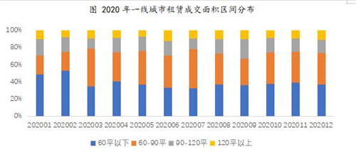 一線城市租客消費(fèi)降級(jí)顯著,月均支出和租住面積均縮減。根據(jù)貝殼研究院數(shù)據(jù),2020年,一線城市租客套均支出同比下降5.8%,其原因一方面是由于租金水平的下降,另一方面則是租客租住面積下降。2020年一線城市60-90平米的房屋成交占比同比去年提高了3.7個(gè)百分點(diǎn),60平米以下的房屋占比則基本持平,90平米以上的房屋占比均小幅下降。部分租客因受疫情的影響,會(huì)選擇工作周邊的小戶型房屋,以減少公共交通的出行,租金成本下降則推動(dòng)了這種趨勢(shì)。