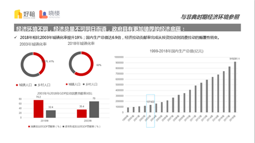 在經(jīng)濟(jì)環(huán)境層面,中國(2019年)經(jīng)濟(jì)總量已接近100萬億元,經(jīng)濟(jì)底蘊(yùn)之雄厚今非昔比,2018年相比2003年城鎮(zhèn)化率提升19%,國內(nèi)生產(chǎn)總值達(dá)6.9倍,經(jīng)濟(jì)拉動(dòng)貢獻(xiàn)率完成從投資拉動(dòng)到消費(fèi)拉動(dòng)的顛覆性轉(zhuǎn)變。再結(jié)合內(nèi)外部環(huán)境來看,非典時(shí)期城鎮(zhèn)化需求、人口紅利逐步釋放,經(jīng)濟(jì)處于高度上升期,而當(dāng)前正處于轉(zhuǎn)變發(fā)展方式、優(yōu)化經(jīng)濟(jì)結(jié)構(gòu)、轉(zhuǎn)換增長動(dòng)力的三大戰(zhàn)略轉(zhuǎn)型期,經(jīng)濟(jì)增速總體放緩。
