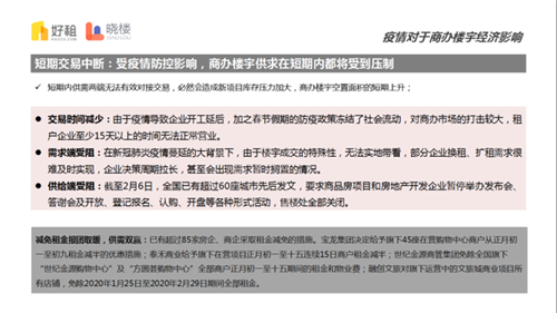 專題報(bào)告還指出,受疫情持續(xù)的影響,短期內(nèi)供需兩端無法有效對(duì)接交易,必然會(huì)造成新項(xiàng)目庫存壓力加大和商辦樓宇空置面積的短期上升。具體而言,一是交易時(shí)間減少,租戶企業(yè)至少15天以上的時(shí)間無法正常營業(yè)。二是需求端受阻,實(shí)地帶看等關(guān)鍵環(huán)節(jié)無法正常進(jìn)行,部分企業(yè)換租、擴(kuò)租需求很難及時(shí)實(shí)現(xiàn),企業(yè)決策周期拉長,甚至?xí)霈F(xiàn)需求暫時(shí)擱置的情況。三是供給端受阻,多地房產(chǎn)發(fā)布會(huì)、答謝會(huì)及開放、登記報(bào)名、認(rèn)購、開盤等各種形式活動(dòng)被政府發(fā)文叫停,售樓處全部關(guān)閉。