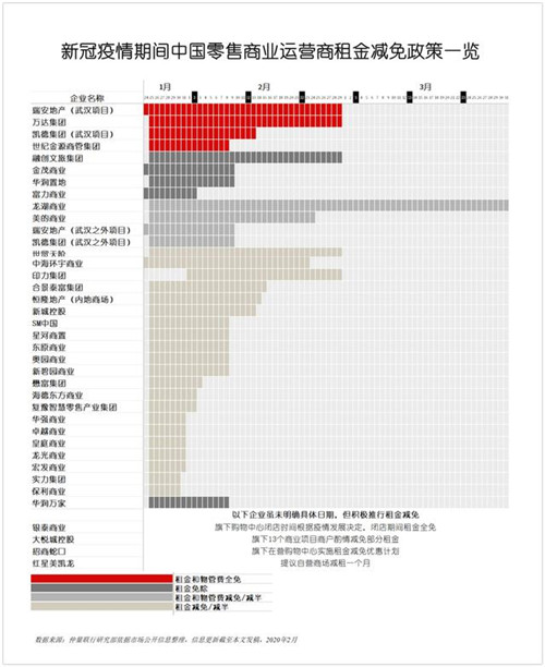 “唇齒相依,共度難關(guān)”,危機(jī)中頻現(xiàn)中國零售運(yùn)營(yíng)商的責(zé)任與擔(dān)當(dāng)。對(duì)于大型商家而言,租賃面積大進(jìn)而房地產(chǎn)成本高,且公司規(guī)模導(dǎo)致運(yùn)營(yíng)成本高企,對(duì)疫情導(dǎo)致的市場(chǎng)變化難以快速調(diào)整。對(duì)于個(gè)體、小規(guī)模經(jīng)營(yíng)者而言,較低的抗風(fēng)險(xiǎn)能力或已無法扛過短期入不敷出的債務(wù)風(fēng)險(xiǎn)。而商場(chǎng)與商戶唇齒相依,國內(nèi)數(shù)百家零售物業(yè)運(yùn)營(yíng)商實(shí)行免租或減租的政策,與商家共度難關(guān)。租金減免政策能在短期內(nèi)一定程度緩解商家的經(jīng)營(yíng)困難,然而這部分經(jīng)營(yíng)性壓力并未消除,只是轉(zhuǎn)嫁至運(yùn)營(yíng)商一方,風(fēng)險(xiǎn)共擔(dān)。