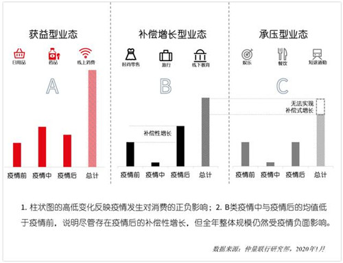 B類補(bǔ)償增長(zhǎng)型業(yè)態(tài):在疫情期間的需求被積壓,結(jié)束后消費(fèi)力將集中釋放,短期消費(fèi)市場(chǎng)或出現(xiàn)補(bǔ)償式增長(zhǎng),但全年數(shù)據(jù)仍受疫情負(fù)面影響。代表業(yè)態(tài):時(shí)尚零售、旅游、線下教育、大健康產(chǎn)業(yè)等。