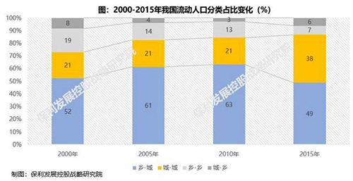 2000年以來,中國“鄉(xiāng)-城”(人口從農(nóng)村遷移至城鎮(zhèn))的流動人口占比呈現(xiàn)“先增后減”趨勢,在2010年到達高峰,占全國流動人口63%,隨后年均減少2.9%。與此同時,“城-城”(人口從城鎮(zhèn)遷移至城鎮(zhèn))流動持續(xù)增加,2010年后占比年均增加3.3%,2015年達38%。