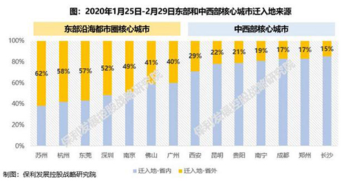 長三角、珠三角、京津冀三大城市群對于國內人口依然具有超強磁吸作用,尤其是都市圈內的核心城市,顯得“熠熠生輝”。全國近八成的跨省流動人口集聚東部沿海。2020年春節(jié)后,三大都市圈核心城市51%的遷入人口來自外省。