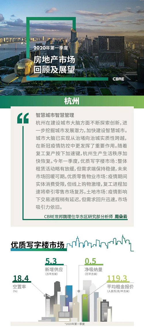 “2020年一季度的新冠疫情與超長春節(jié)假期無疑對整體商業(yè)地產(chǎn)市場帶來一定程度的沖擊,但多以短期影響為主。受惠于杭州優(yōu)異的疫情防控與及時的政策引導(dǎo),僅在一季度末就能觀察到諸多市場活力復(fù)蘇的跡象。傳統(tǒng)金融行業(yè)自去年下半年開始不斷提升熱度,在新出臺的多項利好措施的加持下,主導(dǎo)一季度全市寫字樓租賃需求。杭城代表性的TMT行業(yè)更是持續(xù)補(bǔ)足市場受疫情影響出現(xiàn)的新增空置。零售市場雖在短期內(nèi)遭到?jīng)_擊大,但消費需求依舊強(qiáng)勁,在疫情間得到飛速成長的線上銷售渠道與零售新科技也將為未來零售市場的發(fā)展注入活力。隨著復(fù)工進(jìn)程的提速,城市建設(shè)也在快速恢復(fù)活力,因為工期暫停而延遲交付的供應(yīng)即將順利入市,其中多個項目有著良好的預(yù)租情況;同時,即將在下季度全線開通運營的‘換乘之王’地鐵5號線,也將進(jìn)一步提升各商務(wù)區(qū)的通達(dá)性,優(yōu)化城西與城北板塊的交通網(wǎng)絡(luò),并重點利好未來科技城、蔣村、運河等區(qū)域。2020年的杭州商業(yè)地產(chǎn)市場必將以其強(qiáng)大的韌性,在動態(tài)變化中尋求高質(zhì)量發(fā)展的最優(yōu)解。”