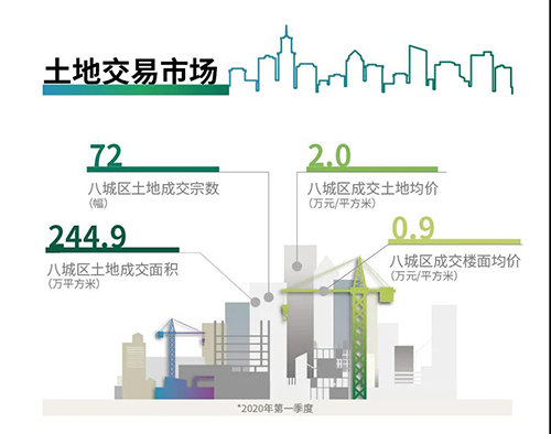 疫情爆發(fā)期間有多塊土地出讓遭到臨時中止,不少地塊延遲掛牌,在一定程度上延緩了市場需求的釋放。伴隨著疫情逐步得到控制,和市場信心的持續(xù)復(fù)蘇,從市場建設(shè)用地成交面積與成交溢價率兩方面均可看到一月到三月的市場熱度變化。一月八城區(qū)土地成交面積環(huán)比下降23.1%,二月持續(xù)環(huán)比下降49.8%,直到三月呈現(xiàn)觸底回升跡象,環(huán)比上漲36%;在溢價率方面亦可看到類似趨勢,土拍市場平均溢價率在一月環(huán)比下跌11.5%,二月環(huán)比下降4.7%之后,在三月出現(xiàn)回暖跡象,環(huán)比微漲4.2%。