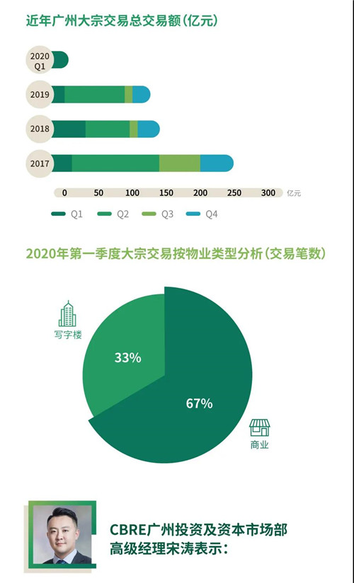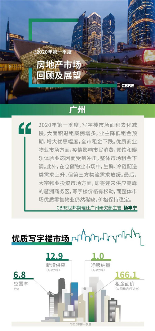 “2020年第一季度,廣州及周邊珠三角城市的工業(yè)物業(yè)出售案例顯著增長,除了由于產(chǎn)業(yè)轉(zhuǎn)型升級的原因以外,疫情對部分制造業(yè)和外貿(mào)的影響可能也增加了此類資產(chǎn)的出售機會。但展望未來六個月,符合機構(gòu)投資者需求的寫字樓及零售物業(yè)仍然稀缺,價格仍將保持堅挺。”