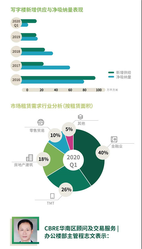 需求方面,金融行業(yè)占全市成交的首位,建設(shè)銀行租用天德廣場T2超過2萬平方米,平安人壽保險從非優(yōu)質(zhì)寫字樓升級到三元里中心,租用超過4,000平方米;其次為TMT和房地產(chǎn)建筑,華為在廣東國際大廈擴張接近1,500平方米;新興彩妝品牌完美日記也在本季錄得2萬平方米琶洲園區(qū)的擴張。