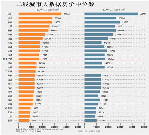 二線城市房價中位數(shù)的平均值為17000元/建筑平方米,比上月漲跌-438元/建筑平方米,其中廈門以35843元/建筑平方米居第一位。