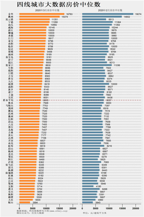 四線城市房價中位數(shù)的平均值為8005元/建筑平方米,比上月漲跌-52元/建筑平方米。其中金華以16793元/建筑平方米居第一位。
