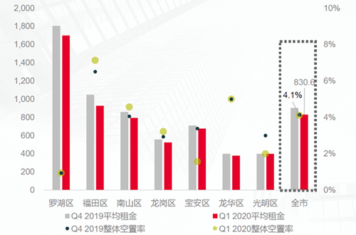 根據(jù)戴德梁行研究院發(fā)布的《2020年一季度深圳商辦市場回顧與展望》研究報告顯示:受疫情爆發(fā)的影響,深圳甲級寫字樓市場于節(jié)后短期內(nèi)基本處于停滯狀態(tài);一季度全市甲級寫字樓平均租金環(huán)比上年末下降3%,空置率24.6%;全市優(yōu)質(zhì)購物中心最優(yōu)層平均租金較去年末下降 7.97%;二季度商業(yè)空置率料將上升,預(yù)計四季度市場活躍度有望逐漸恢復(fù)。