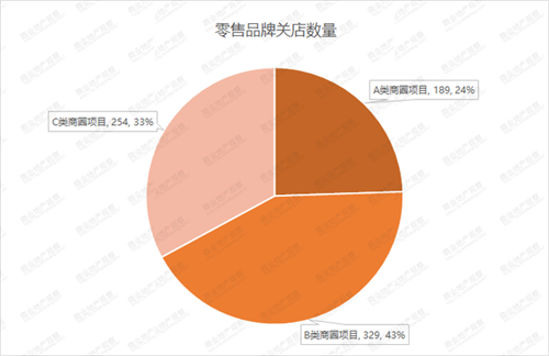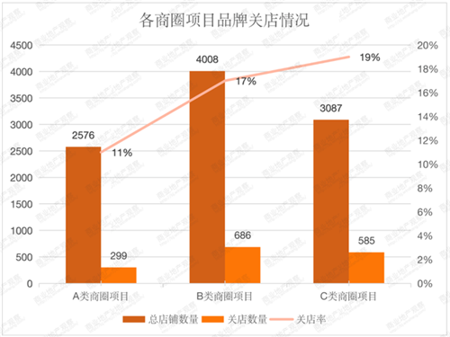 其中A類商圈購(gòu)物中心平均關(guān)店數(shù)量為33家,關(guān)店率為11%,略高于近年同期數(shù)據(jù),但遠(yuǎn)遠(yuǎn)低于B類商圈C類商圈購(gòu)物中心的關(guān)店率,值得注意的是,C類商圈項(xiàng)目關(guān)店率出現(xiàn)兩級(jí)分化現(xiàn)象,有4家項(xiàng)目關(guān)店率低于8%,但也有3家項(xiàng)目關(guān)店率高于31%。