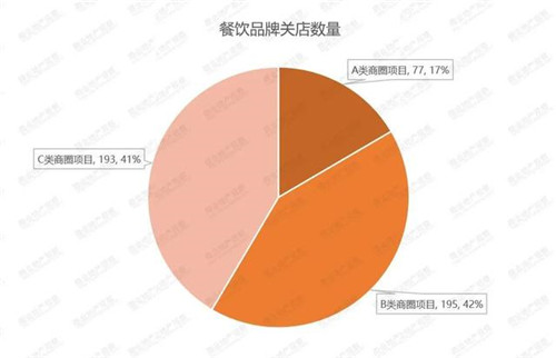 這20家商場(chǎng)按商圈分布進(jìn)行分析,多處在B類和C類商圈內(nèi),其中C類商圈的項(xiàng)目有9家,而A類商圈較少,從側(cè)面可以反映出A類商圈運(yùn)營(yíng)的穩(wěn)定程度與抗風(fēng)險(xiǎn)能力,但整體來看餐飲業(yè)態(tài)受沖擊較大,與其他業(yè)態(tài)相對(duì)比尤為明顯。