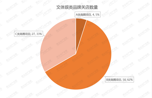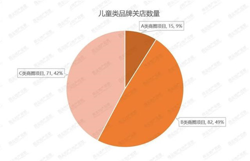 按商圈分布分析,A類商圈內(nèi)商業(yè)項(xiàng)目表現(xiàn)一直穩(wěn)定,9個(gè)商業(yè)項(xiàng)目中兒童業(yè)態(tài)的關(guān)店數(shù)量共15家,占比極低;B類和C類商圈內(nèi)商業(yè)項(xiàng)目?jī)和瘶I(yè)態(tài)關(guān)店數(shù)量基本持平,分別為82家和71家,單個(gè)項(xiàng)目最多關(guān)店數(shù)量不超過20家,該業(yè)態(tài)關(guān)店情況平均占比在10%左右。文體娛業(yè)態(tài)關(guān)店總數(shù)為81家,其中A類商圈僅4家,B類50家,C類27家,遠(yuǎn)低于零售、餐飲等業(yè)態(tài)。
