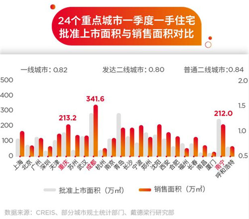 2020年一季度,全國24個重點城市批準上市面積同比減少30.6%;銷售面積同比減少31.6% ;供銷比由2019年第4季度的1.05下降到0.82。主要原因在于疫情期間新供應不足。