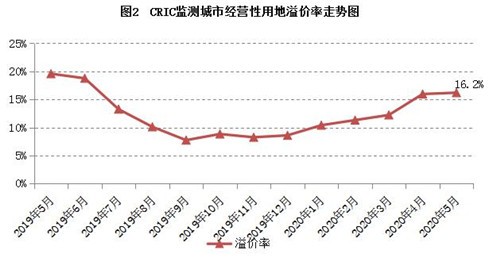 2020年5月,在推進(jìn)生產(chǎn)要素市場化的大環(huán)境下,土地市場交易景氣持續(xù)回升,成交面積創(chuàng)下年內(nèi)新高,溢價率也在上月上升的基礎(chǔ)上再漲0.2個百分點(diǎn),實(shí)現(xiàn)2020年來的5連漲,市場熱度持續(xù)上升。