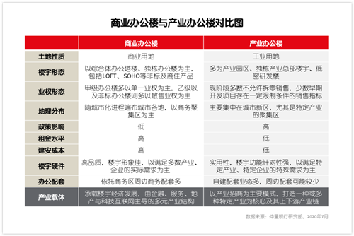 辦公樓是承載產(chǎn)業(yè)發(fā)展的載體,然而用于辦公樓開(kāi)發(fā)的土地并非全是商業(yè)用地,工業(yè)用地上開(kāi)發(fā)的“產(chǎn)業(yè)園區(qū)”或形態(tài)接近商業(yè)辦公樓宇的“產(chǎn)業(yè)辦公樓”都是企業(yè)落戶(hù)且可進(jìn)行工商登記注冊(cè)的辦公空間。我們將商業(yè)用地上開(kāi)發(fā)的辦公樓宇稱(chēng)作“商業(yè)辦公樓(Commercial Office)”,將工業(yè)用地上開(kāi)發(fā)的產(chǎn)業(yè)園區(qū)或滿(mǎn)足企業(yè)辦公功能的樓宇稱(chēng)作“產(chǎn)業(yè)辦公樓(Industrial Office/Business Park)”。對(duì)于市場(chǎng)而言,商業(yè)辦公樓和產(chǎn)業(yè)辦公樓各有優(yōu)勢(shì)?傮w而言,商業(yè)辦公樓主打樓宇經(jīng)濟(jì),開(kāi)發(fā)商通過(guò)資產(chǎn)管理和后期運(yùn)營(yíng)實(shí)現(xiàn)高租金、高入駐、高收益,而企業(yè)客戶(hù)更加多元。相較而言,產(chǎn)業(yè)辦公樓則主要滿(mǎn)足政府區(qū)域經(jīng)濟(jì)發(fā)展的訴求,定向引入科技互聯(lián)網(wǎng)、大健康等戰(zhàn)略新興產(chǎn)業(yè)及其上下游產(chǎn)業(yè)鏈,加速區(qū)域開(kāi)發(fā),推動(dòng)城市產(chǎn)業(yè)結(jié)構(gòu)轉(zhuǎn)型升級(jí)。