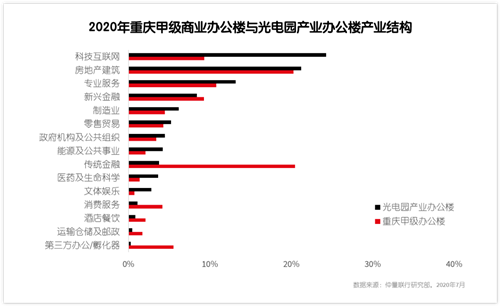 據(jù)仲量聯(lián)行數(shù)據(jù)顯示,重慶甲級(jí)辦公樓與光電園產(chǎn)業(yè)辦公樓的產(chǎn)業(yè)結(jié)構(gòu)相關(guān)性為57.4%;但如果去掉兩個(gè)有明顯傾向性的產(chǎn)業(yè),即青睞產(chǎn)業(yè)樓宇的科技互聯(lián)網(wǎng)業(yè)和青睞商業(yè)樓宇的傳統(tǒng)金融業(yè),兩組數(shù)據(jù)的關(guān)聯(lián)性迅速提升至91.9%。房地產(chǎn)建筑、新興金融、零售貿(mào)易的占比的組間差異不到1%。然而,上述行業(yè)在其他城市進(jìn)駐產(chǎn)業(yè)園區(qū)的概率通常遠(yuǎn)低于進(jìn)駐商業(yè)辦公樓。不得不說(shuō),重慶的“非園區(qū)型”產(chǎn)業(yè)樓宇與商業(yè)樓宇對(duì)多數(shù)企業(yè)而言差別并不大。