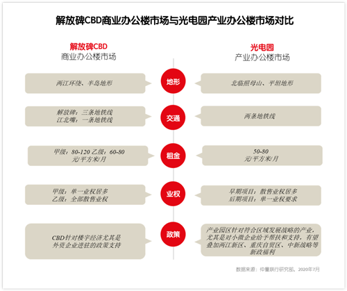 租賃成本優(yōu)勢(shì)。在近兩年來(lái),中小微、初創(chuàng)企業(yè)在科技互聯(lián)網(wǎng)產(chǎn)業(yè)發(fā)展帶動(dòng)下表現(xiàn)相對(duì)活躍,成為辦公需求的核心動(dòng)力。中小微、初創(chuàng)企業(yè)對(duì)辦公空間成本十分敏感。解放碑CBD甲級(jí)辦公樓租金普遍在100元/平方米/月以上,部分品質(zhì)較低的老舊樓宇租金控制在60-80元/平方米/月。而光電園板塊的產(chǎn)業(yè)樓宇租金可低至50-60元/平方米/月,甲級(jí)品質(zhì)的樓宇可以控制在70-80元/平方米/月以?xún)?nèi)。