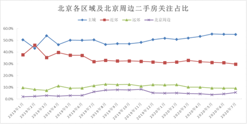 北京周邊作為北京外溢需求的承載地,關(guān)注熱度在疫情后的變化不大,7月,北京周邊二手房關(guān)注指數(shù)為5.7%,較2月微升0.4個(gè)百分點(diǎn)。