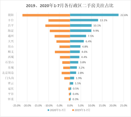 從行政區(qū)上看,今年1-7月,朝陽、豐臺(tái)、昌平的二手房關(guān)注熱度高,位居全市前三,關(guān)注占比分別為22.6%、13.1%、10.1%。關(guān)注熱度較低的為遠(yuǎn)郊區(qū)的懷柔(0.3%)、平谷(0.4%)、延慶(0.5%),關(guān)注熱度低于北京周邊(2.8%)。