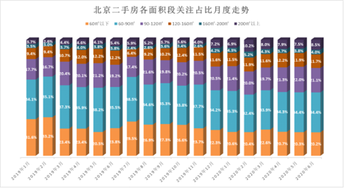 從面積段上看,今年90㎡以上的關(guān)注熱度上升,數(shù)據(jù)顯示,2020年1-7月,90㎡以上的二手房關(guān)注占比為44.7%,較去年同期上升7.5個(gè)百分點(diǎn)。疫情期間居家辦公,購房者對(duì)房屋的追求意識(shí)增強(qiáng),大面積段的房屋關(guān)注度提升。