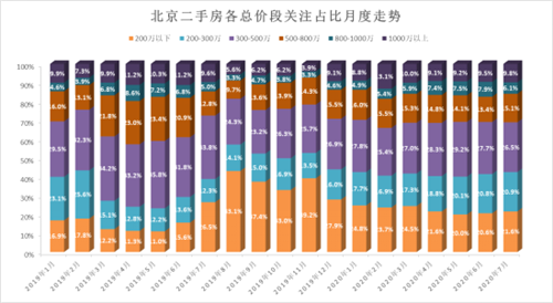 從總價(jià)段上看,購房者關(guān)注的總價(jià)段集中在300-500萬,但該總價(jià)段占比呈現(xiàn)下滑趨勢(shì),根據(jù)數(shù)據(jù)顯示,2020年7月,300-500萬的總價(jià)段關(guān)注占比為26.5%,環(huán)比下降1.2個(gè)百分點(diǎn),同比下降7.3個(gè)百分點(diǎn)。