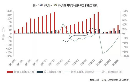 從全市辦公樓市場運(yùn)行情況來看,2020年二季度新開工面積為93.45萬㎡,較一季度出現(xiàn)平穩(wěn)回升,但是依然同比下降14.34%;竣工面積為28.97萬㎡,同比增幅高達(dá)168.58%。