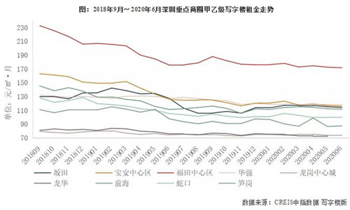 空置方面,受疫情影響,寫字樓租賃需求走弱,整體市場吸納不足、去化周期有所延長,致使主要商圈空置率較去年年底均出現(xiàn)有上升趨勢。下半年深圳寫字樓市場仍將有大量新增供應(yīng)入市,因此,預(yù)計高位的空置率將貫穿2020全年,租金的下行壓力將持續(xù)。