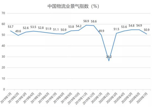 根據(jù)中國物流與采購聯(lián)合會發(fā)布的數(shù)據(jù)顯示,受到中部地區(qū)水災(zāi)的影響,7月份中國物流業(yè)景氣指數(shù)為50.9%,較上月回落4個百分點(diǎn)。