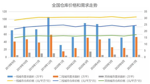 從倉庫價格看,一線城市30.92元/平方/月,環(huán)比上漲2.3%;二線城市24.47元/平方/月,環(huán)比上漲4.7%;其他城市17.27元/平方/月,環(huán)比上漲6.3%;各線城市倉庫價格維持上升。