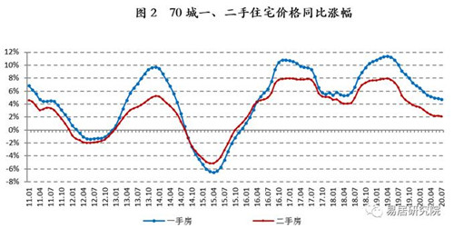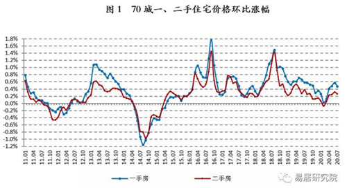 2020年7月,70城一、二手住宅價格同比漲幅分別為4.8%和2.1%,相比6月分別收窄0.12、0.09個百分點,預計未來幾個月一二手房價同比漲幅基本保持平穩(wěn)。