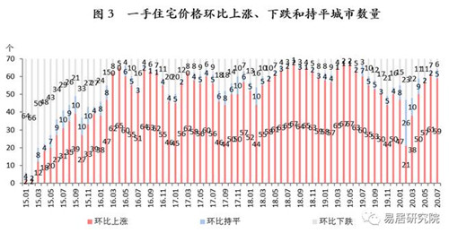 2020年7月,70個大中城市一、二手住宅價格環(huán)比漲幅分別為0.47%和0.26%,相比5月分別收窄0.11和0.05個百分點。目前70城新房價格已經(jīng)連續(xù)63個月上漲。
