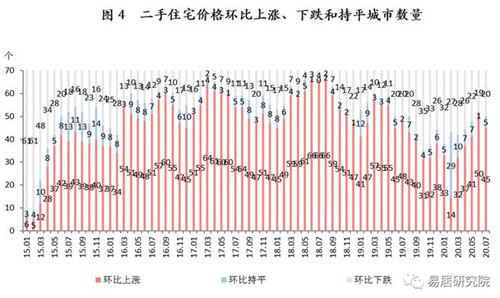7月70個大中城市中,二手住宅價格上漲的城市有45個,持平的城市有5個,下跌的城市有20個。相比6月,7月房價上漲的城市數(shù)量減少5城,房價持平的城市數(shù)量增加4城,房價下跌的城市數(shù)量增加1城。